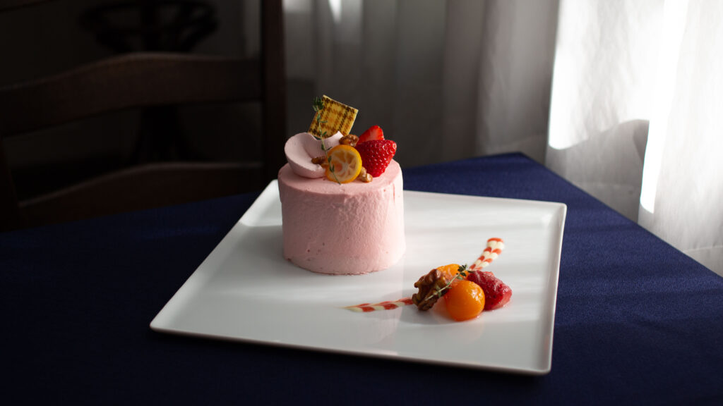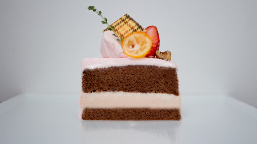 今回の展覧会のタイトルでもある「カワイイ界隈!」にふさわしく淡いピンクのご褒美感のあるホールケーキに仕上げました。中のスポンジは、ココアをベースにジンジャー・カルダモン・ナツメグなどを使った、ほのかに香るスパイスがアクセントとなったシフォンケーキ。間に挟んだブラッドオレンジのムースが食感と爽やかさを演出します。二人の作風に通ずる「憧れやトキメキ」の世界を感じてください。